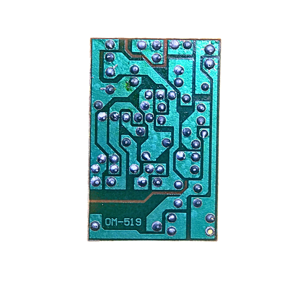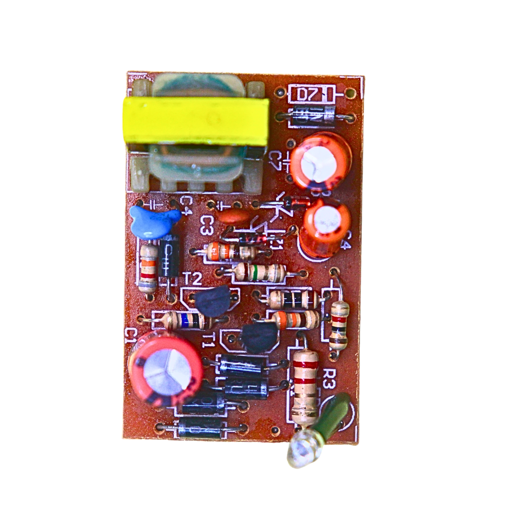 The circuit produces an output of 5V and 1A, it is mainly used in cell phone chargers, microcontrollers, Bluetooth/WiFi modules etc. The circuit board converts an input voltage of 220V AC and converts it into a 5V DC output. The circuit has a transformer that steps down the voltage from 220V AC to 5V AC, The four diodes in the circuit act as a rectifier that converts the AC voltage to DC voltage. The circuit consists of numerous resistors and capacitors, which acts as filters. The resistors and capacitors smooth the current and the voltage flow giving an approximate, average voltage value that is required.